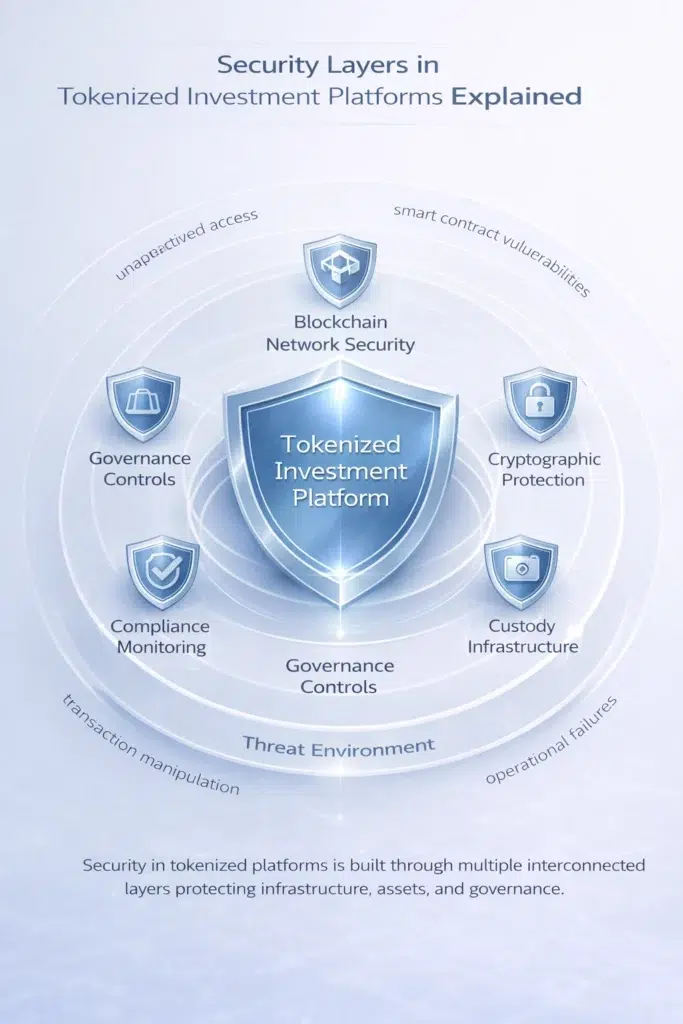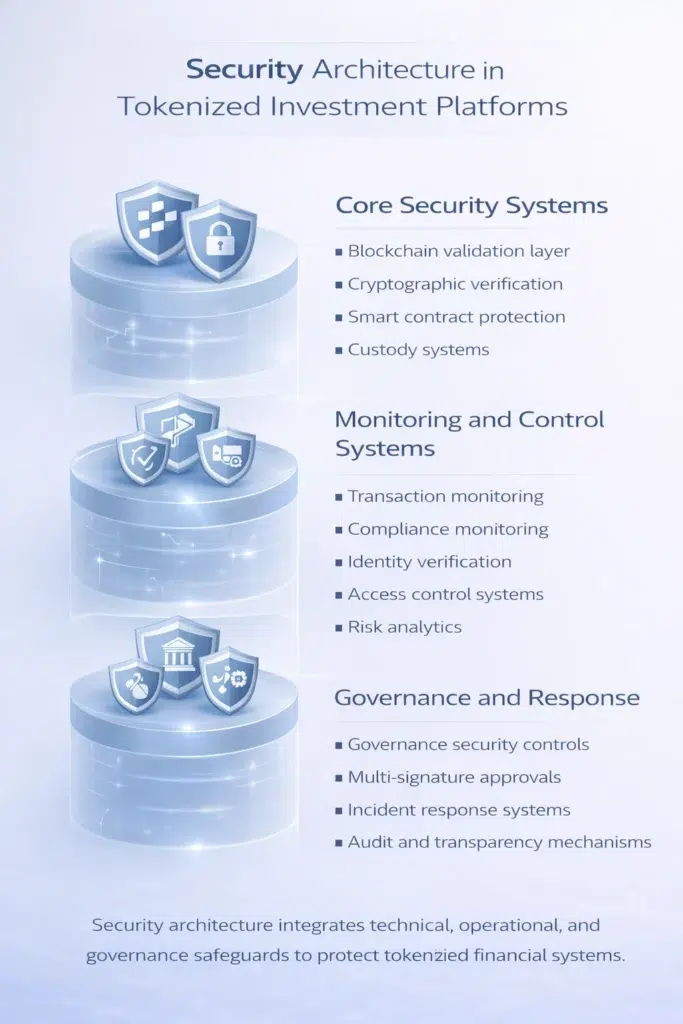 Security in tokenized investment systems does not rely on a single protective mechanism.